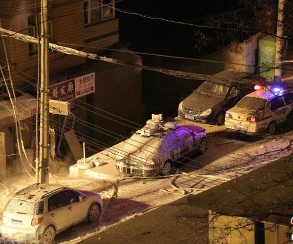 目前,伤者已全部送到医院救治,现场局面平稳可控。图为爆炸现场停放的小汽车车顶上积满灰层。